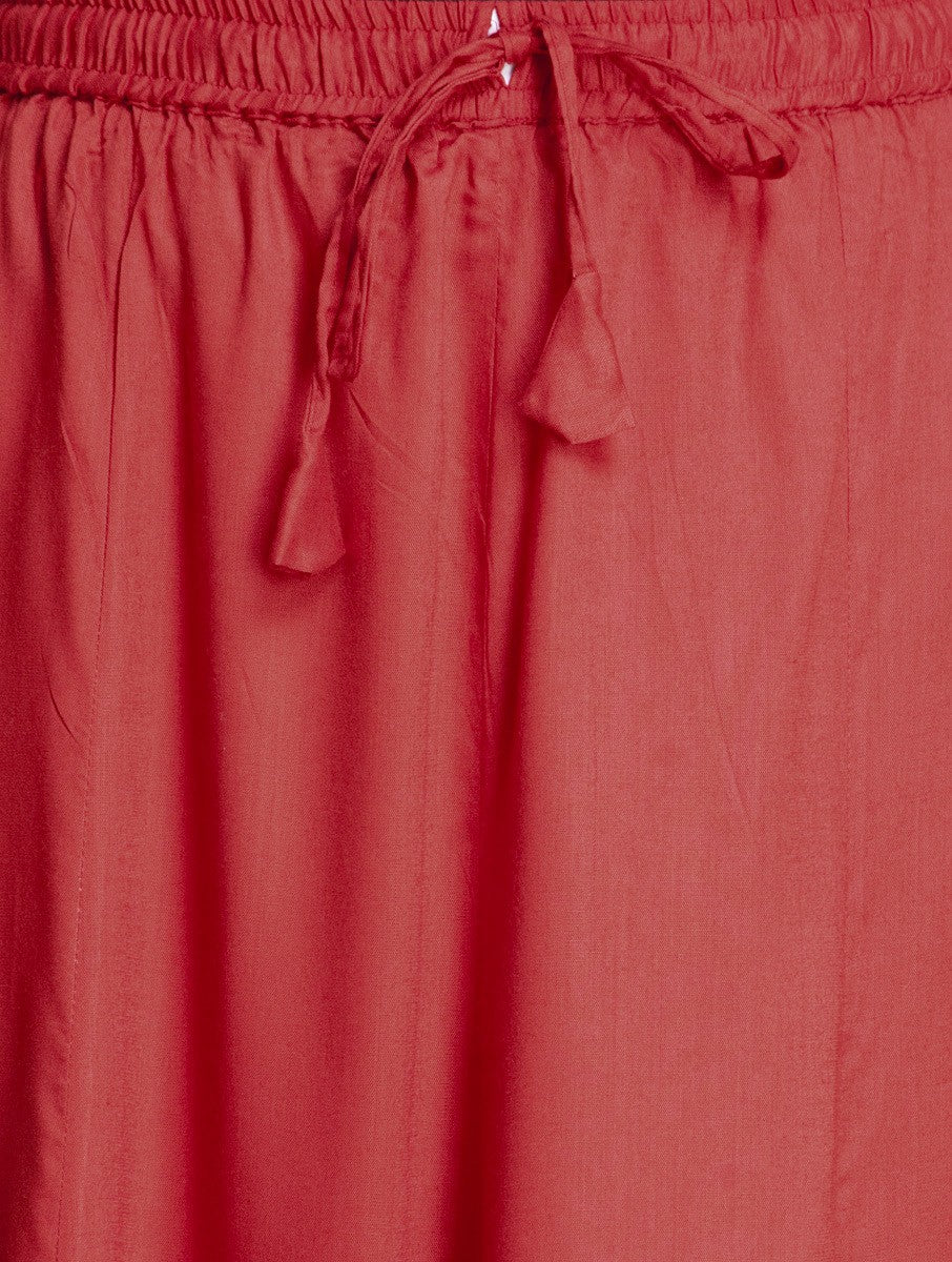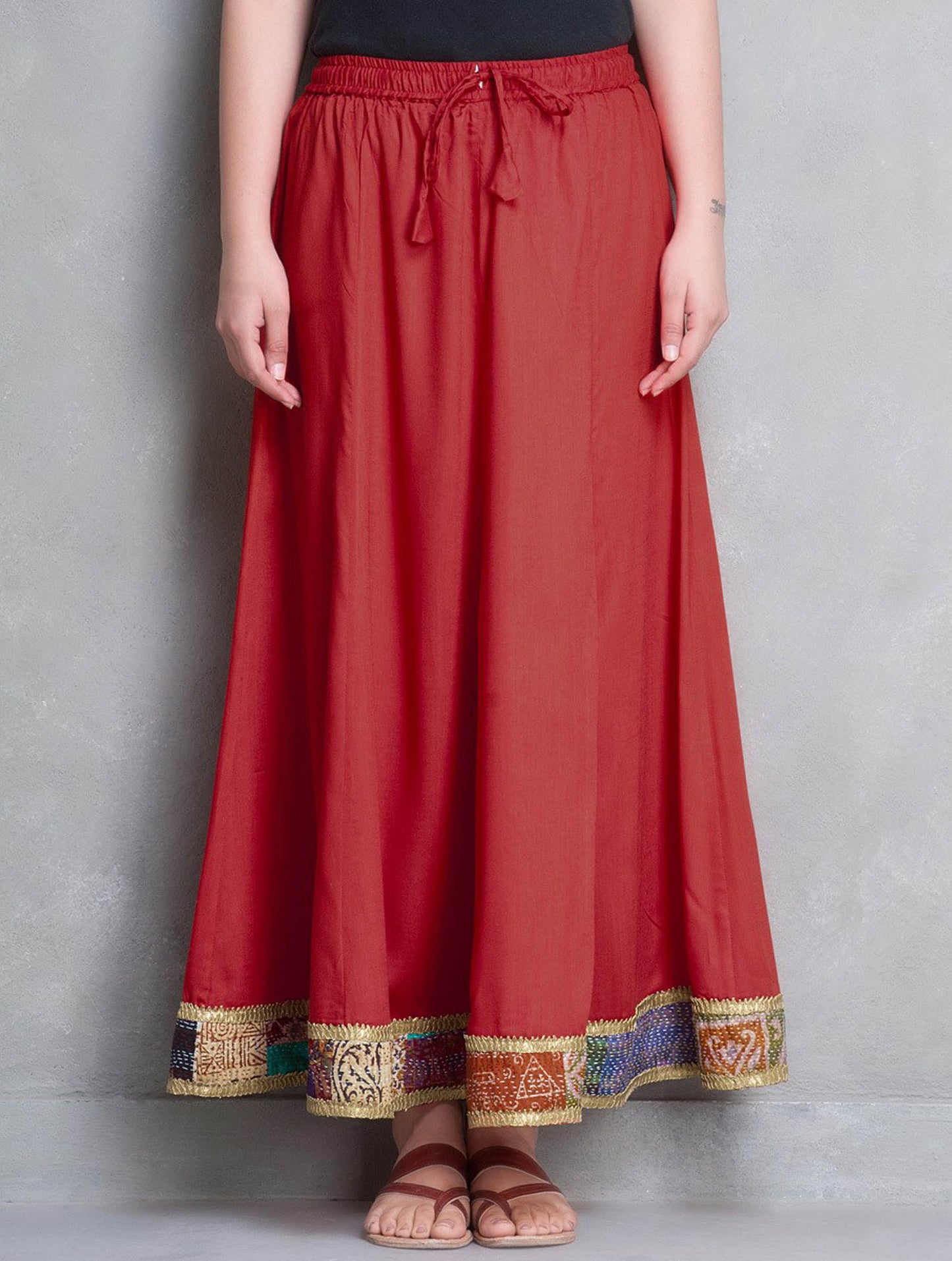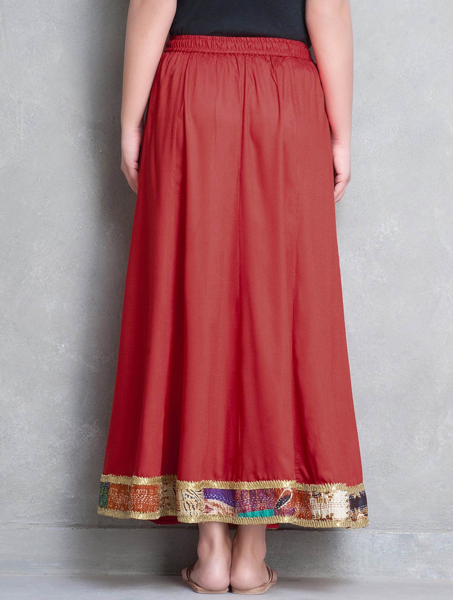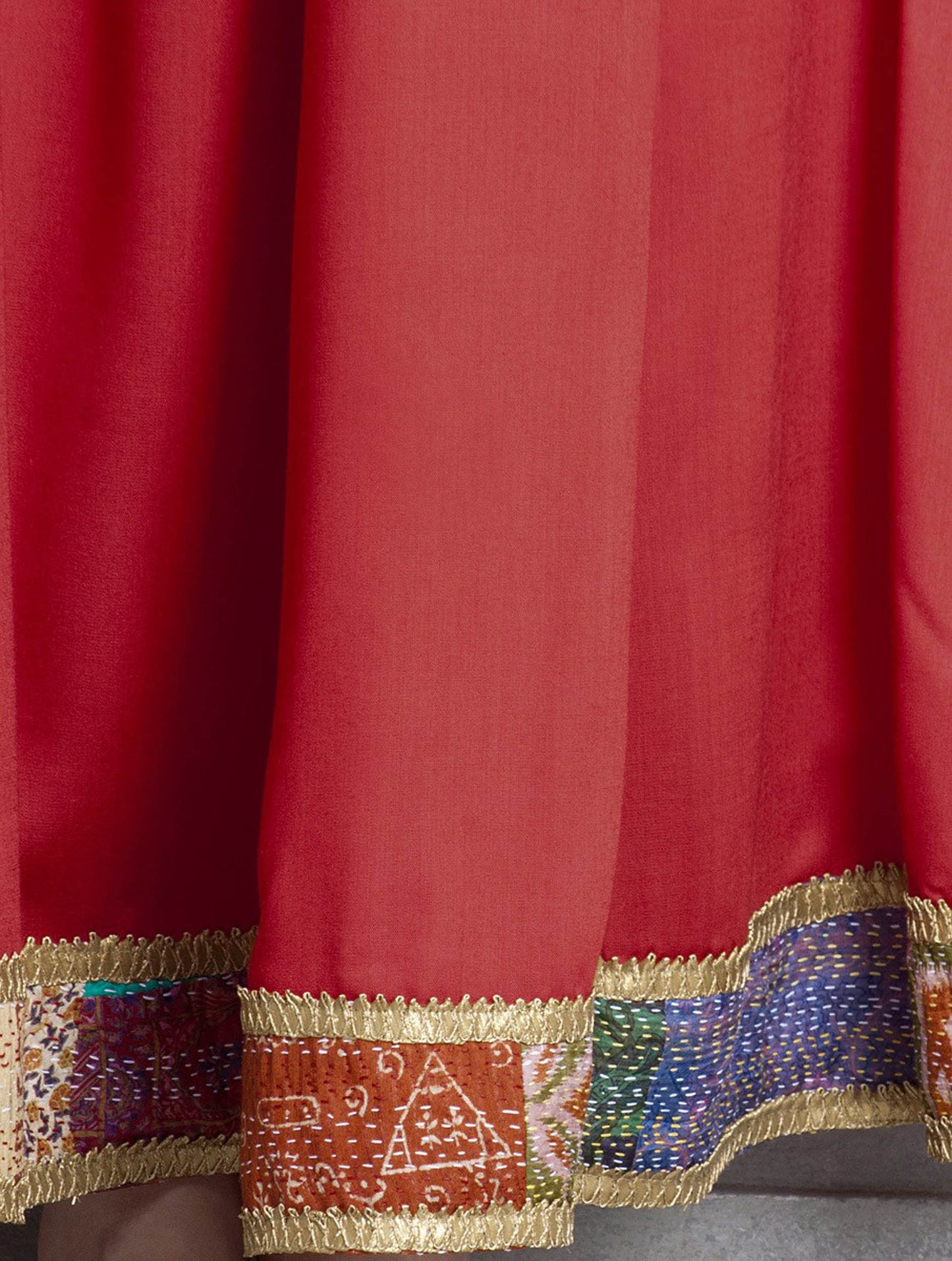 GHOOMAR: Red cotton silk kali skirt with kantha and gota border